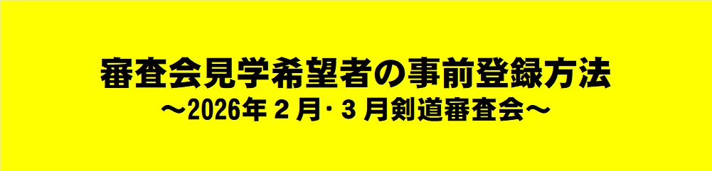 審査会見学希望者の事前登録について Twitter Facebook はてブ Pocket LINE コピー 2026.01.09 2026年2月・3月の剣道審査会について、受審者以外の審査会への入場(観覧席のみ)を登録を条件に可能となりますので、付き添いや見学を希望される方は、下記を参照のうえ登録し、入場整理券を入手して下さい。 見学者の事前登録 007.ビデオ撮影等の禁止について 20190222(要項同封)